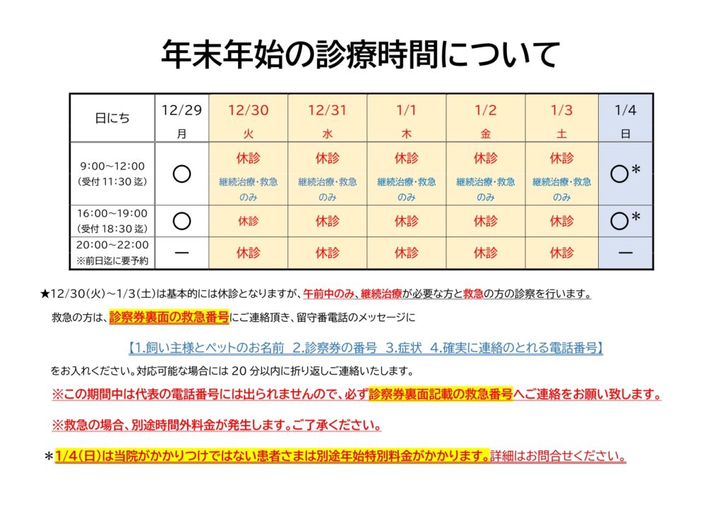 年末年始の診療について 2025年12月23日 お知らせ 年末年始の診療についてお知らせです(^^) 詳細は以下の通りとなります。 ご不明な点等ありましたら、2025年12月29日の診療時間内までにお問合せください。 宜しくお願いいたします。 フードのご注文はお早めに!